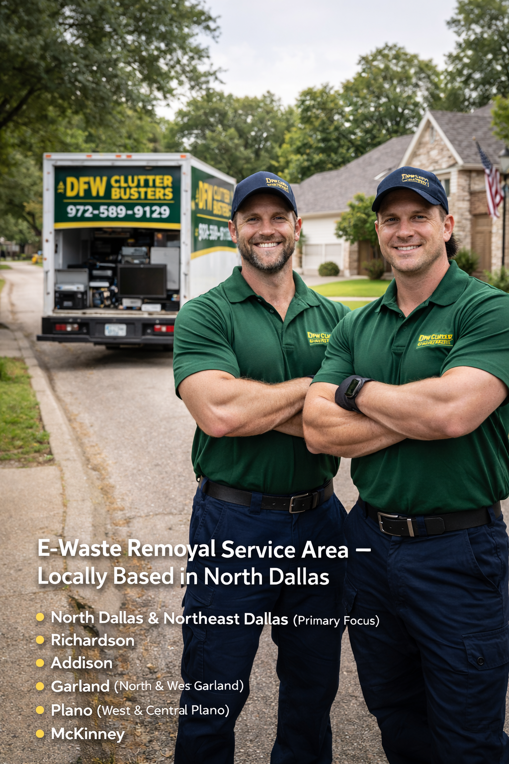 DFW Clutter Busters is proudly based in Dallas 75231, and we focus our e-waste removal services on nearby neighborhoods and suburbs so we can arrive faster, offer tighter scheduling windows, and keep pricing competitive. By staying local, we avoid long drive times and provide a true neighborhood-level experience—perfect for homeowners who need old electronics gone quickly, safely, and without the stress.