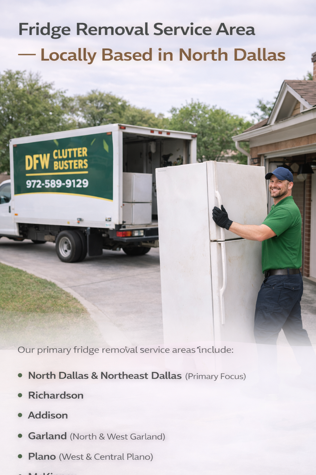 DFW Clutter Busters is proudly based in Dallas 75231, and we focus our fridge removal services on nearby neighborhoods and suburbs so we can arrive faster, offer tighter scheduling windows, and keep pricing competitive. By staying local, we avoid long drive times and provide a true neighborhood-level experience—perfect for homeowners who need heavy, hard-to-move refrigerators gone quickly and without the stress.