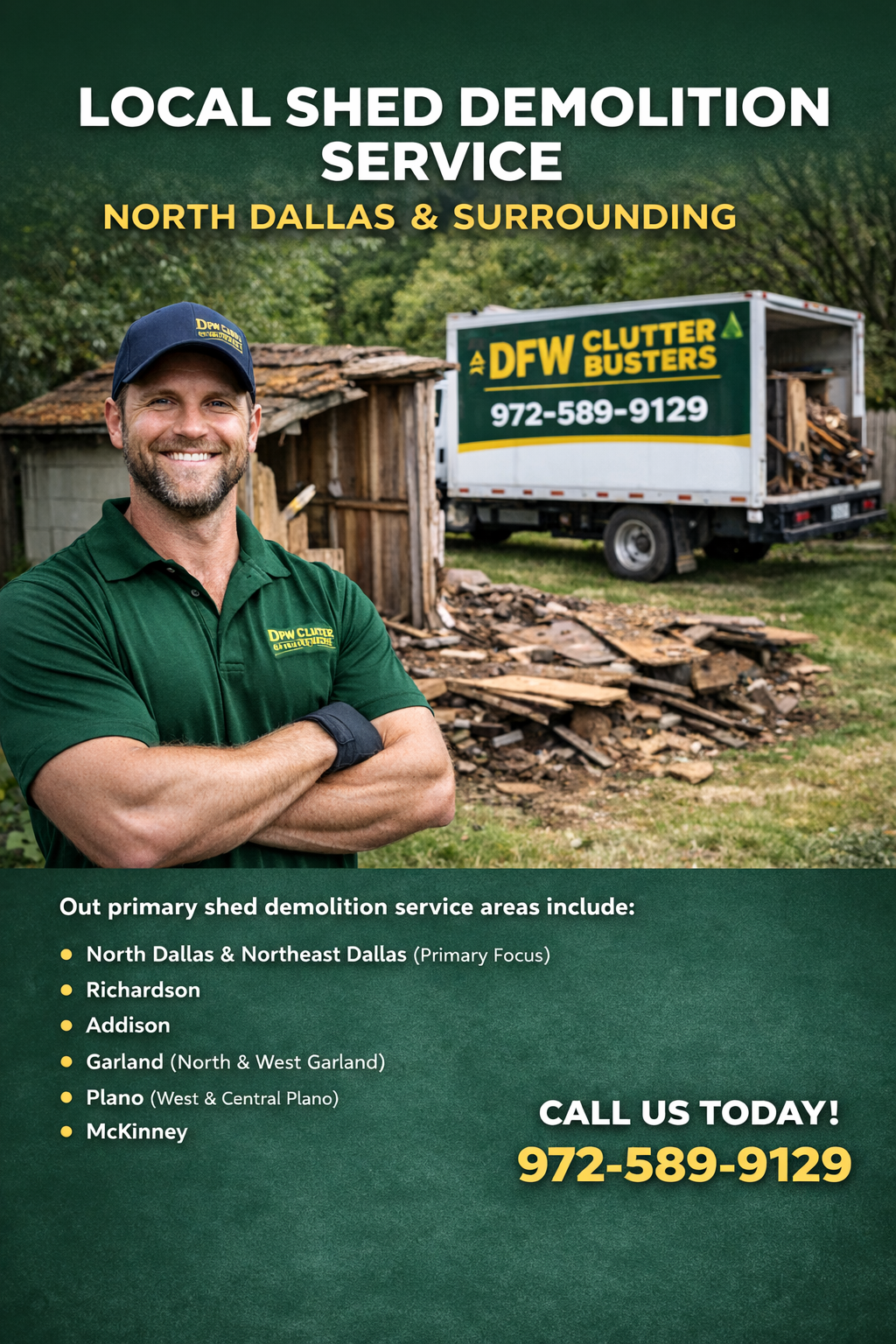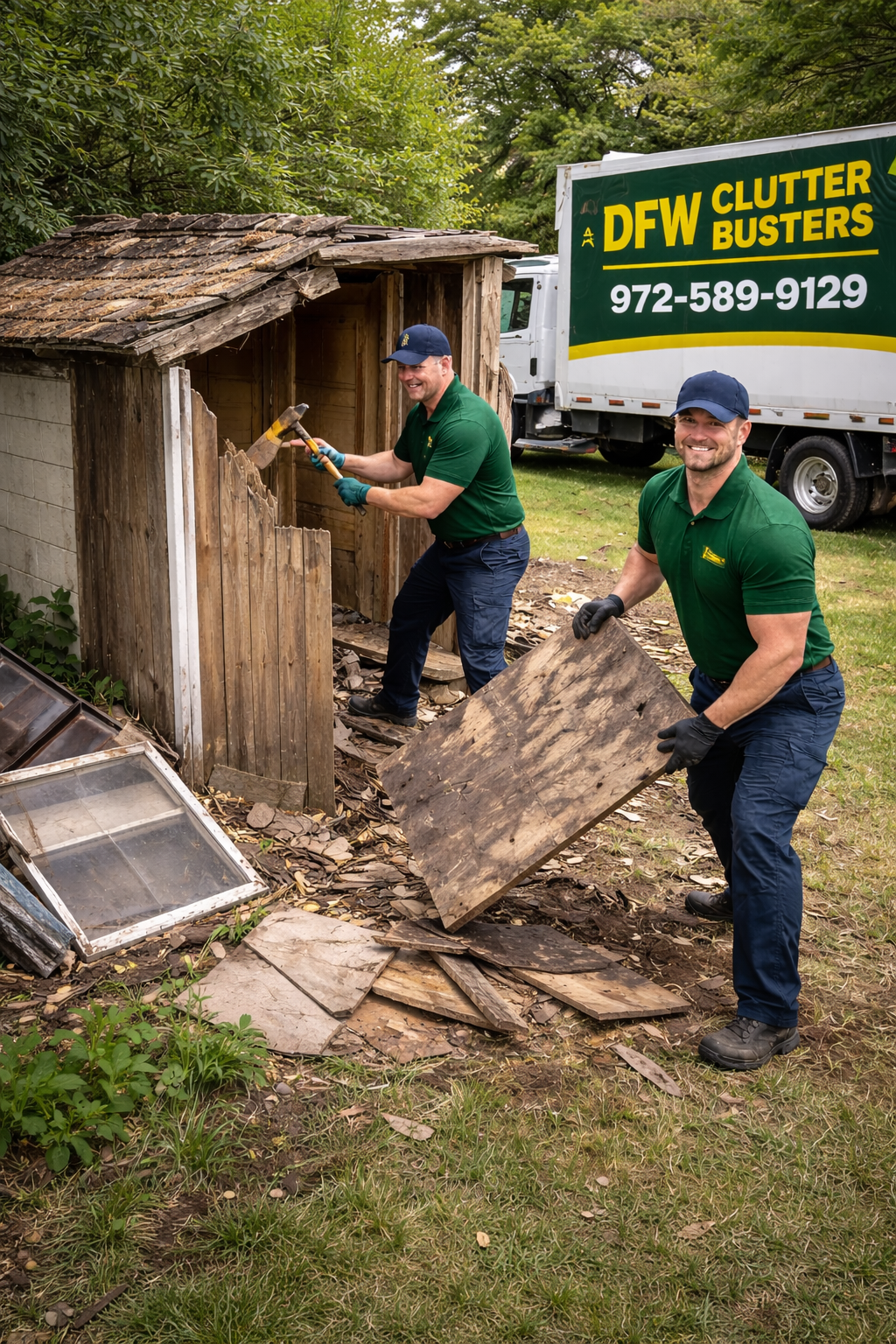 DFW Clutter Busters makes shed demolition simple for homeowners across North Dallas, Richardson, Addison, McKinney, Garland, and Plano. Buster and the team safely tear down and remove all types of backyard sheds—wood, metal, plastic/resin, lean-to structures, and aging storage buildings—without damaging your yard, fence, or nearby structures.